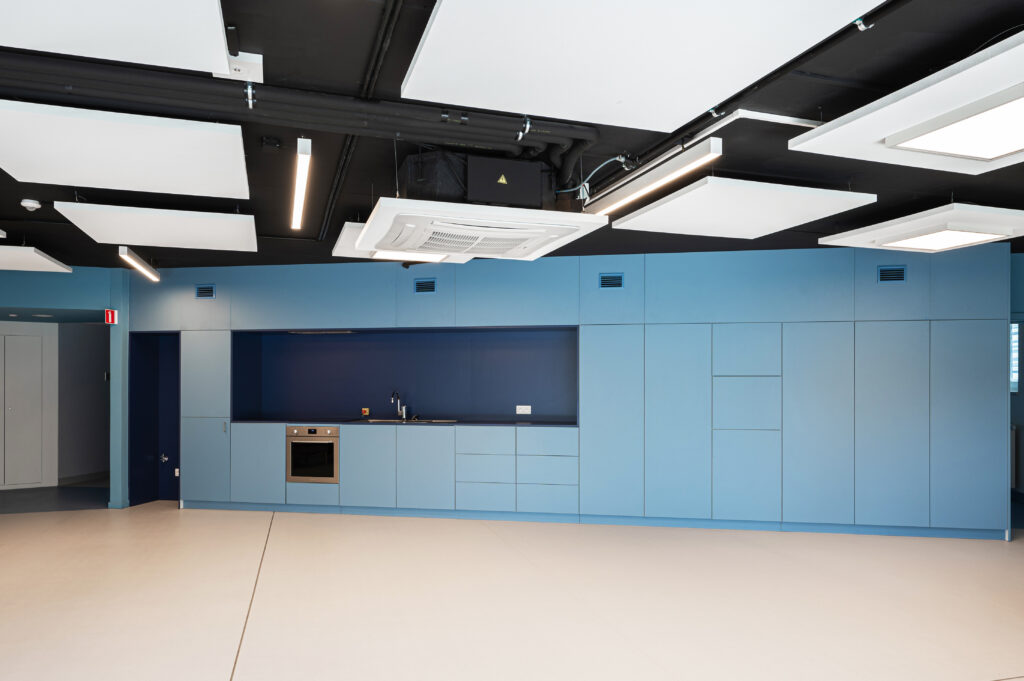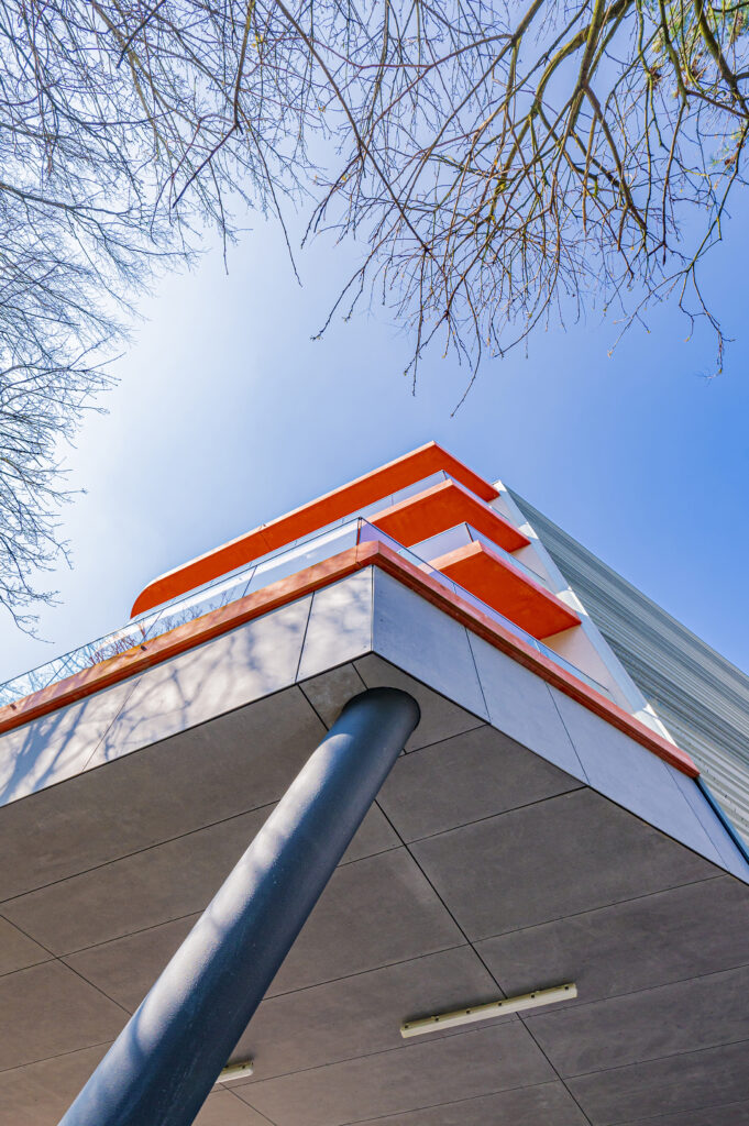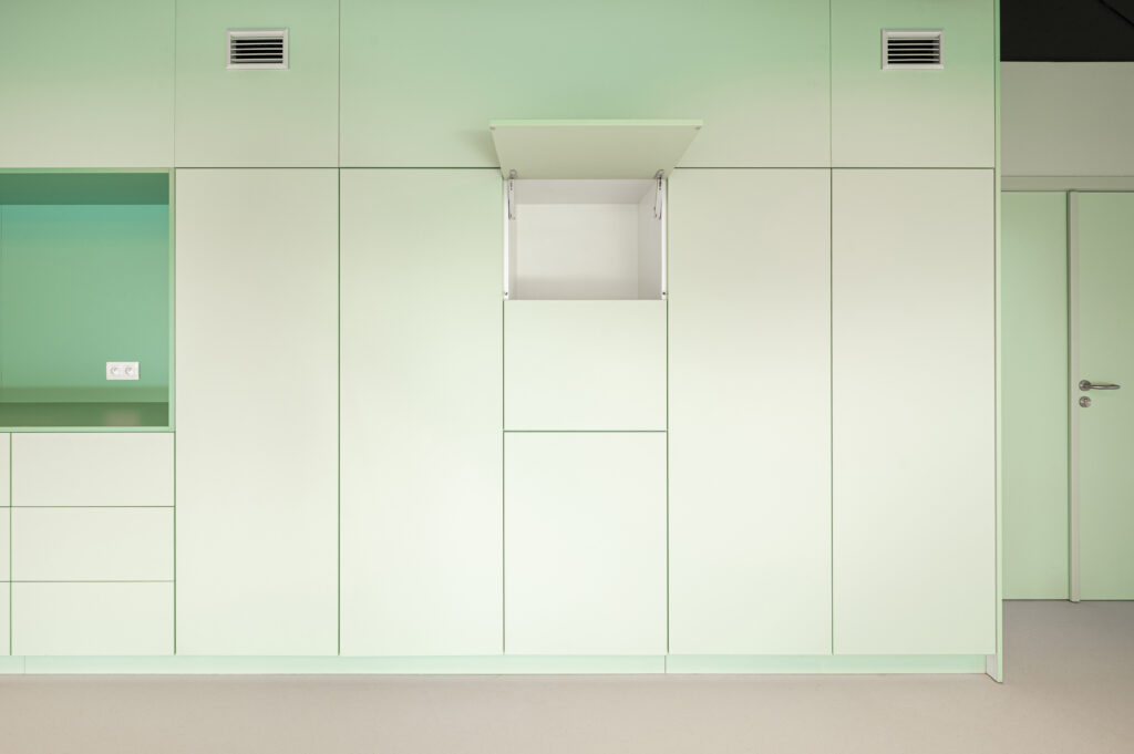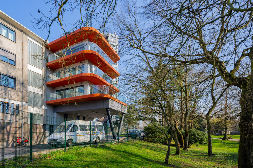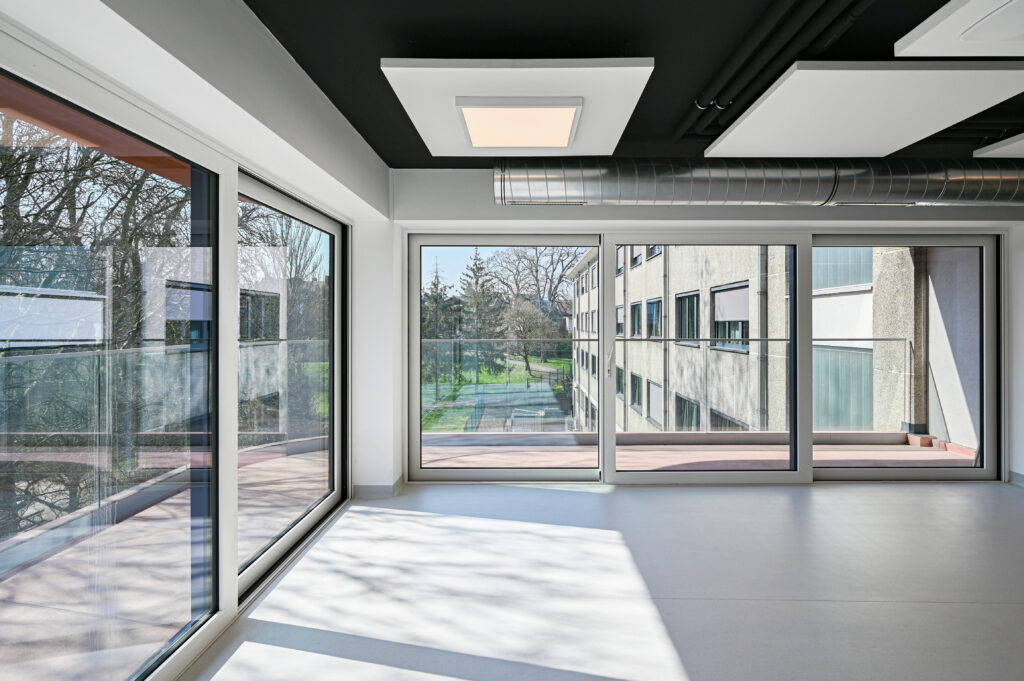 La première partie du chantier a concerné la rénovation technique du bâtiment existant, organisé en deux ailes et réparti sur cinq niveaux. Quatre d’entre eux ont fait l’objet d’une remise à niveau ciblée. Les améliorations ont porté notamment sur l’installation d’un réseau de ventilation double flux dans l’ensemble des chambres — 112 unités et 2 chambres de court séjour — afin d’assurer une meilleure qualité d’air et un confort accru.