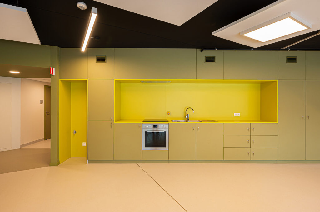 En parallèle, le projet prévoyait l’extension du bâtiment existant, en continuité de l’aile A, côté est. Cette nouvelle construction développe 976 m² pour un volume total de 2.362 m³. Elle accueille des espaces communs dédiés au confort et au bien-être, un réfectoire repensé, des vestiaires ainsi que plusieurs locaux techniques. Cette extension permet de mieux répondre aux besoins actuels des résidents et du personnel, tout en offrant des espaces plus fluides et mieux adaptés aux usages contemporains.